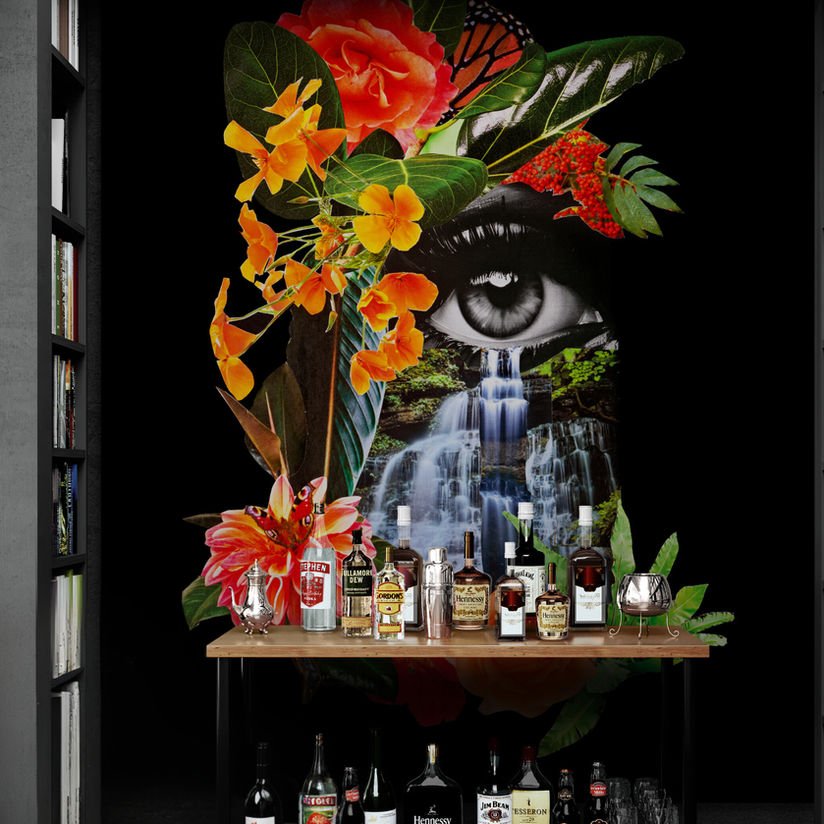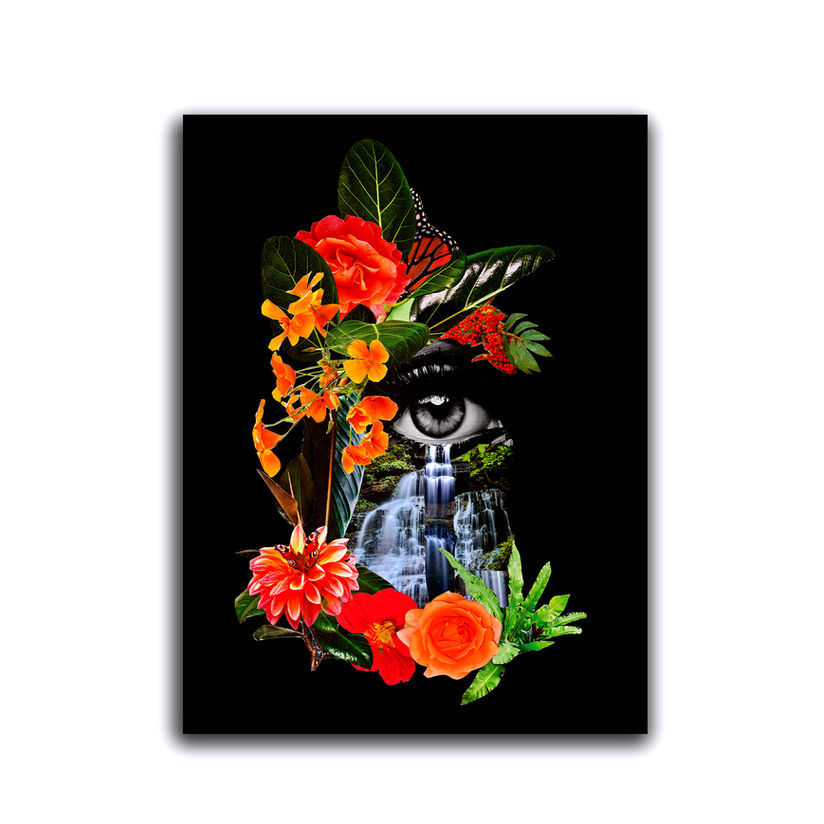 "Eyeofeden" is a vibrant collage that draws the viewer into a lush, tropical paradise. At its center, a striking eye stares out, surrounded by a burst of vivid tropical flowers in rich hues of red, orange, and green. Cascading from the mesmerizing focal point is a serene waterfall, its glistening waters enhancing the dreamlike quality of the scene. The juxtaposition of the eye’s intense gaze with the tranquil beauty of the flowers and waterfall creates a captivating and surreal exploration of nature and perception.