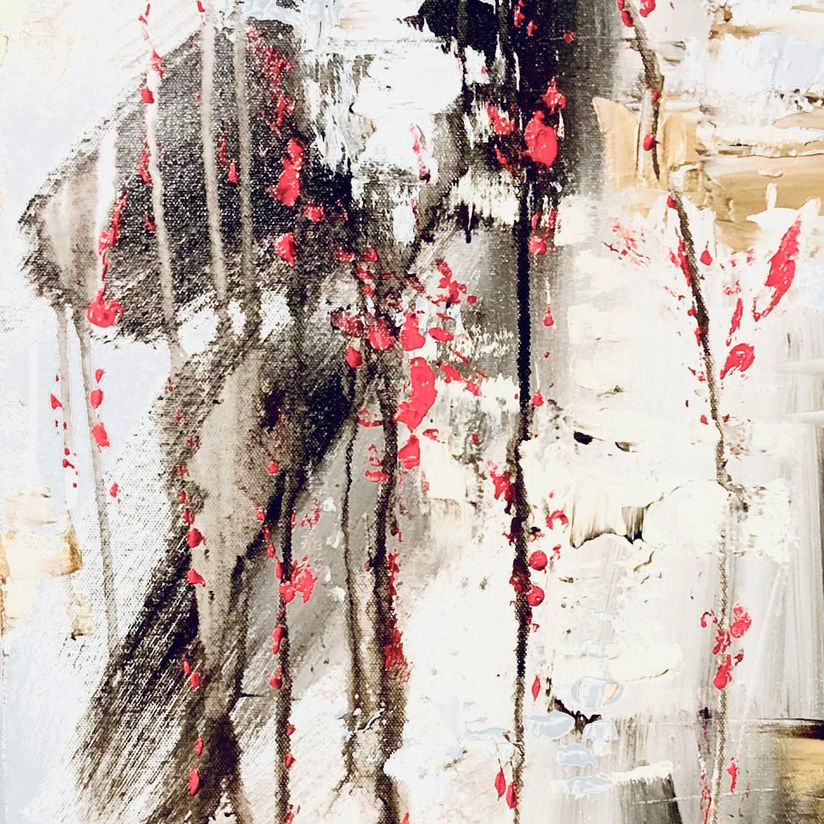 "Koi" is an acrylic painting in neutral colors with a striking small red detail that draws the eye. The composition is balanced by faded black brush strokes at the top and bottom, creating a harmonious contrast and adding depth to the overall design.