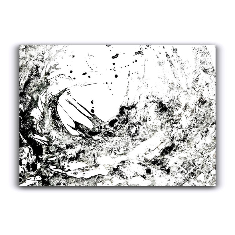 "Odyssey" is an abstract piece where the interplay of black and white acrylic paint creates a textured appearance and a nuanced fading effect. The gentle removal of some black paint reveals subtle shading, adding depth and a sense of journey through the evolving gradients.