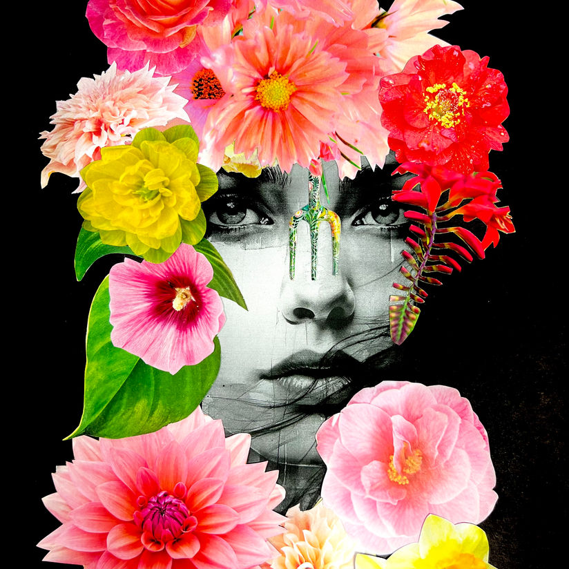 "Ziva" is a mixed media collage that centers on a woman's face surrounded by a vivid array of bright traditional and exotic flowers. The dynamic fusion of floral patterns and the serene visage creates a striking contrast, celebrating the blend of cultural richness and personal elegance.